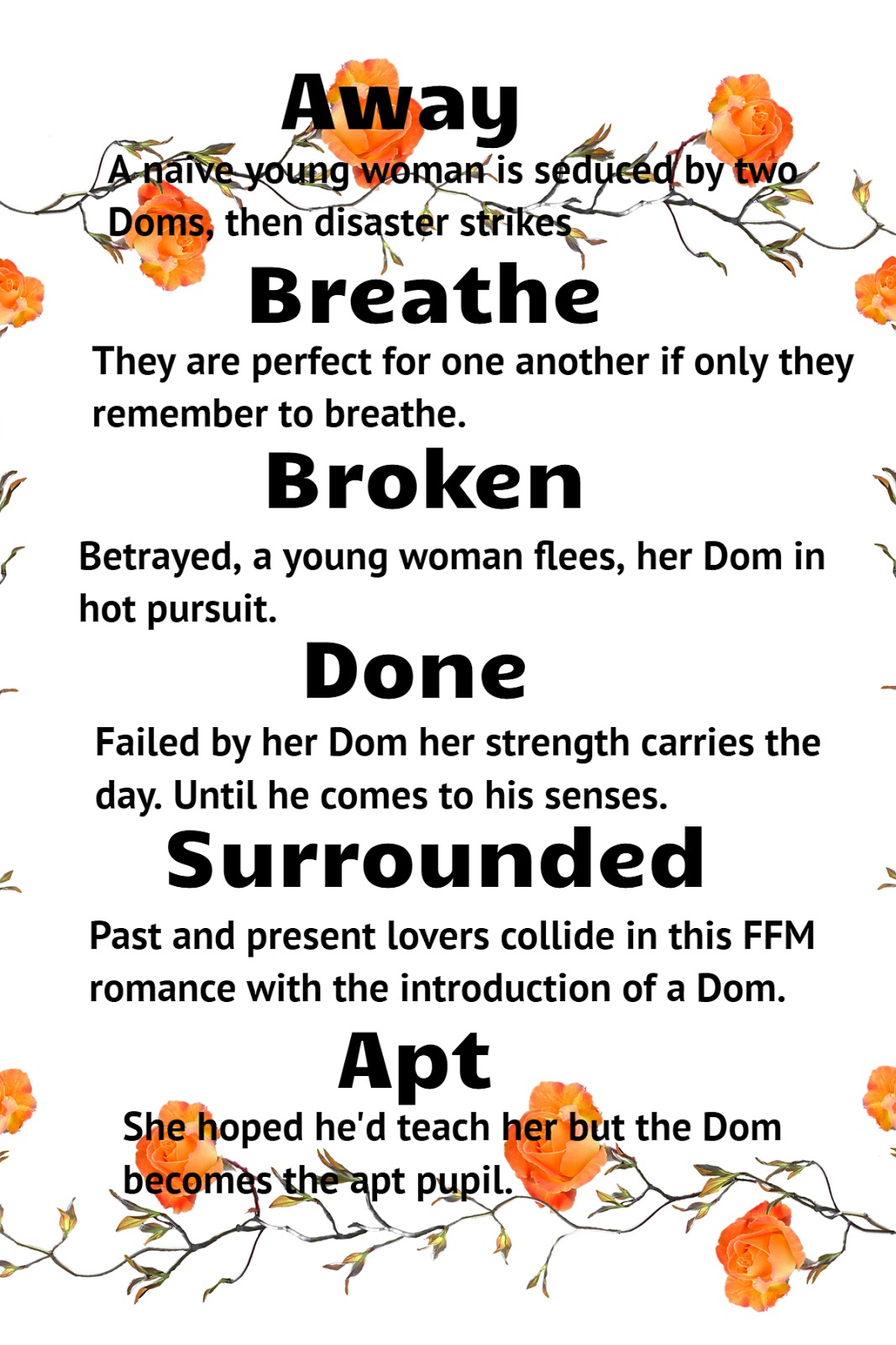 romances- Away, Breathe, Broken, Done, Surrounded and Apt.